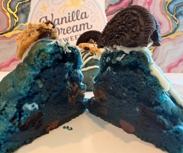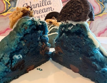 Our Cookie Monster is a New York- Style chunky cookie with a vibrant blue dough, loaded with milk chocolate chips, white chocolate chucks, and pieces of Chips Ahoy and Oreo cookies. Every bite is a mix of soft, crunchy and chocolate goodness that'll make you say...