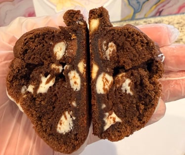 New York-style cookie, soft on the inside and crispy on the outside, bursting with rich chocolate flavor. Made with a mix of cocoa, milk chocolate, and white chocolate chips- a chocolate lover's dream!